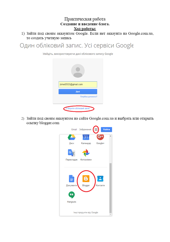 Практическая работа Создание и введение блога. Ход работы: Зайти под своим аккаунтом Google. Если нет аккаунта на Google.com.ua, то создать учетную запись Зайти под своим аккаунтом на сайте Google.com.ua и выбрать или открыть ссылку blogger.com Подтвердить свой профиль Нажать на кнопку Но...