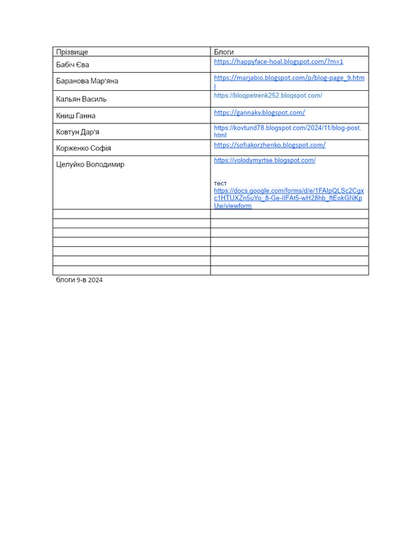 Прізвище Блоги Бабіч Єва https://happyface-hoal.blogspot.com/?m=1 Баранова Мар'яна https://marjabio.blogspot.com/p/blog-page_9.html Кальян Василь https://blogpetrenk252.blogspot.com/ Книш Ганна https://gannakv.blogspot.com/ Ковтун Дар'я https://kovtund78.blogspot.com/2024/1...